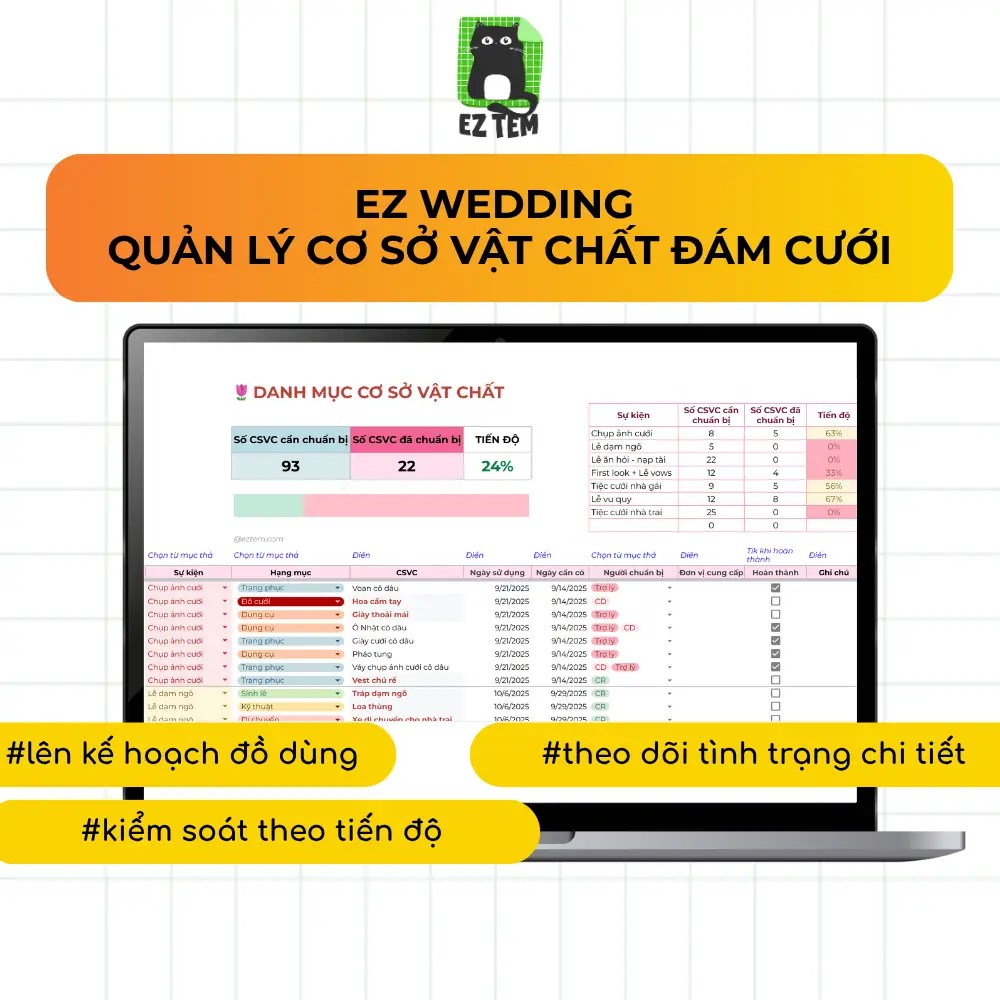 - Lập kế hoạch chi tiết: Hỗ trợ ghi lại đầy đủ thông tin của từng vật phẩm: Tên CSVC (ví dụ: váy cưới, hoa cầm tay, loa thùng...), Ngày cần có (deadline), Người chịu trách nhiệm chuẩn bị (Cô Dâu, Chú Rể, Trợ lý), và Đơn vị cung cấp.